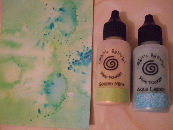 Golden Mint and Purple Violet were a couple of my favourites, can you see the sheen from the mica? The powders are so easy to use, in this piece I sprayed a piece of card with water then flicked the powder over the wet area then and sprayed more water over the top.
